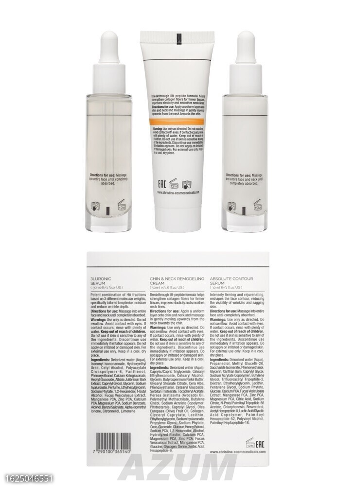 Serum: Apply a few drops and massage into previously cleansed face until completely absorbed. 3-Hyaluronic Acid: Apply a few drops and massage over the previously cleansed face, neck and décolleté. Remodeling cream: apply to the chin, face contour and neck, rub in with massaging movements until completely absorbed.