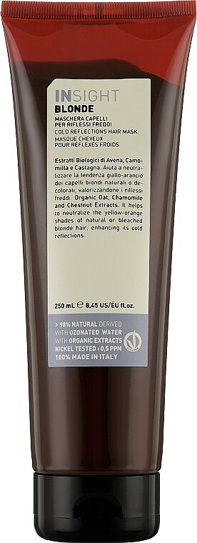 Insight Blonde Cold Reflections Mask is a professional mask for bleached, highlighted, and natural blonde hair, designed to maintain a pure, cool tone without brassiness. The mask's formula effectively neutralizes yellow-orange pigments while deeply moisturizing and nourishing hair, which is especially vulnerable after bleaching.