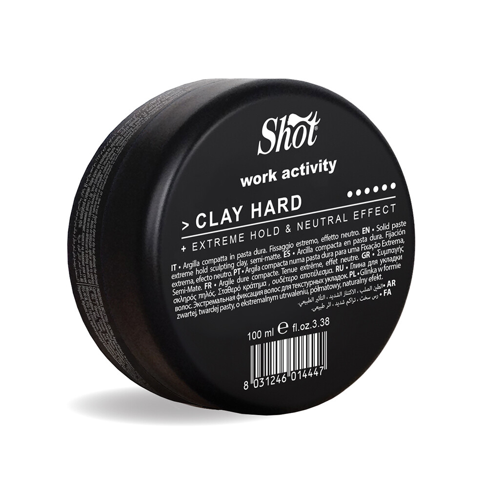 Shot Clay Hard Wax Work Activity is a professional hair styling clay with extreme hold that provides strong hold all day long without stickiness or weight.